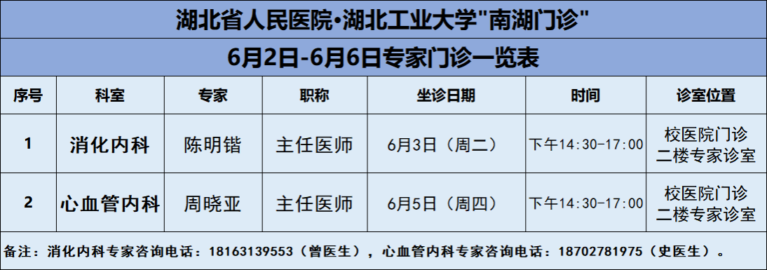 6月2日-6月6日,欧洲冠军联赛_2024年欧洲杯投注-【官网直营】医院将邀请湖北省人民医院知名专家——消化内科陈明锴主任、心血管内科周晓亚主任两位专家教授前来校医院坐诊(具体坐诊信息见下),请广大师生、周边居民持续关注南湖门诊专家坐诊信息,如有: