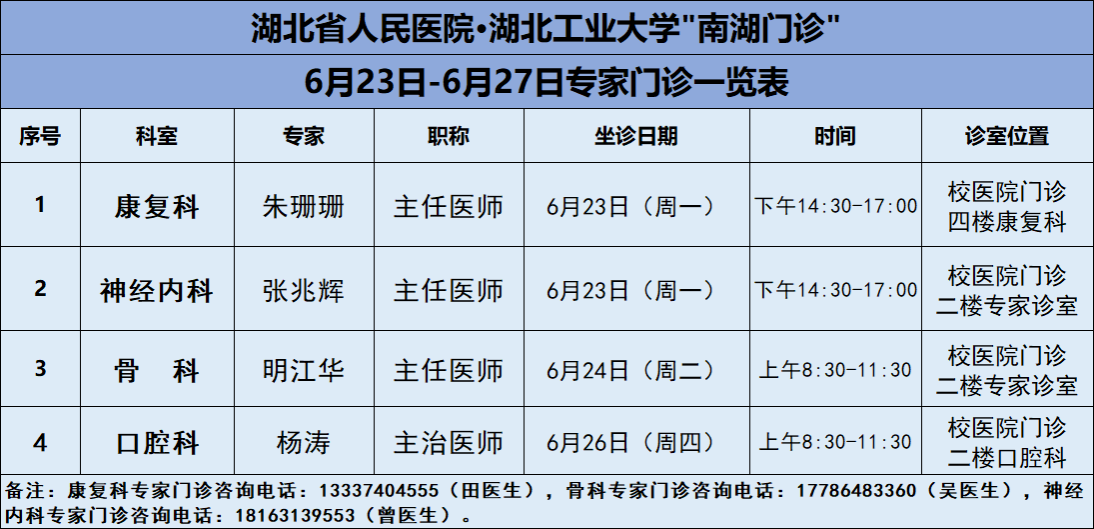 6月23日-6月27日,欧洲冠军联赛_2024年欧洲杯投注-【官网直营】医院将邀请湖北省人民医院知名专家——康复科朱珊珊主任、神经内科张兆辉主任、骨科明江华主任、口腔科杨涛医生四位专家教授前来校医院坐诊(具体坐诊信息见下),请广大师生、周边居民持续关注南湖门诊专家坐诊信息,如有: