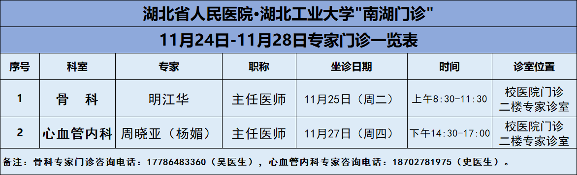 11月24日——11月28日,欧洲冠军联赛_2024年欧洲杯投注-【官网直营】医院将邀请湖北省人民医院知名专家——骨科明江华主任、心内科周晓亚主任两位专家教授前来校医院坐诊(具体坐诊信息见下)。请广大师生、周边居民持续关注南湖门诊专家坐诊信息,如有: