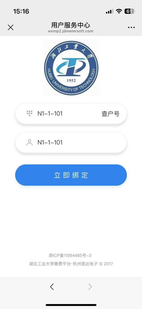 3. 输入户号和户名即可完成绑定,注意:这里户号 = 户名(户号和户名相同,都要输入),户号、户名南区住宅开头为字母“N”,北区住宅开头为字母“B”,后面为楼栋、单元、房号,楼栋没有单元的不输入单元。例如:房间位于南住宅区20栋2单元102房间,则输入:N20-2-102;若房间位于南住宅区33栋1单元101房间,则输入:N33-1-101;若房间位于南住宅区400套平房101房间,400套平房楼栋为64栋,则输入:N64-101