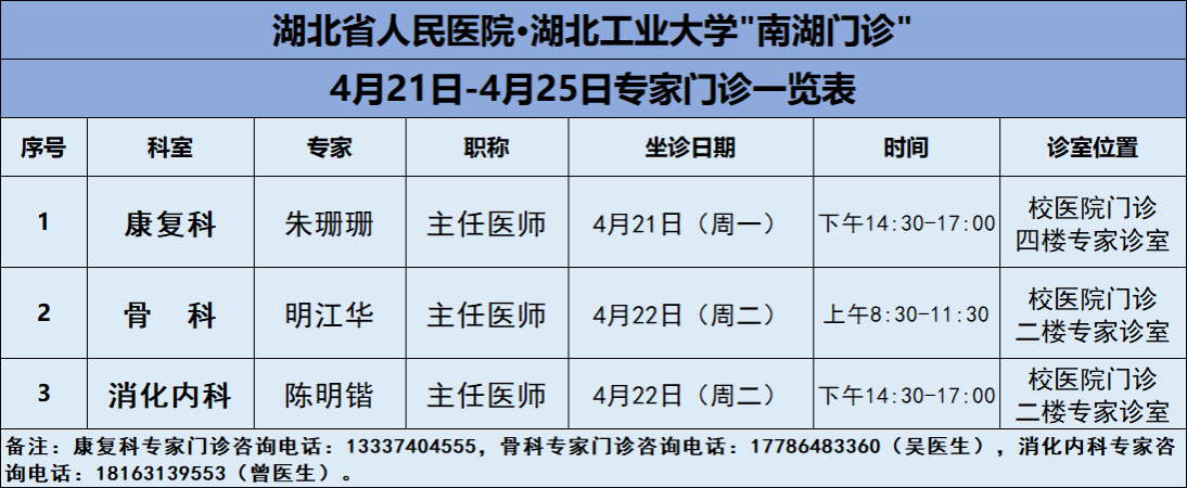 4月21日-4月25日期间,校医院将邀请湖北省人民医院知名专家——康复科朱珊珊主任、骨科明江华主任、消化内科陈明锴主任三位专家教授前来校医院坐诊(具体坐诊信息见下),请广大师生、周边居民持续关注南湖门诊专家坐诊信息,如有