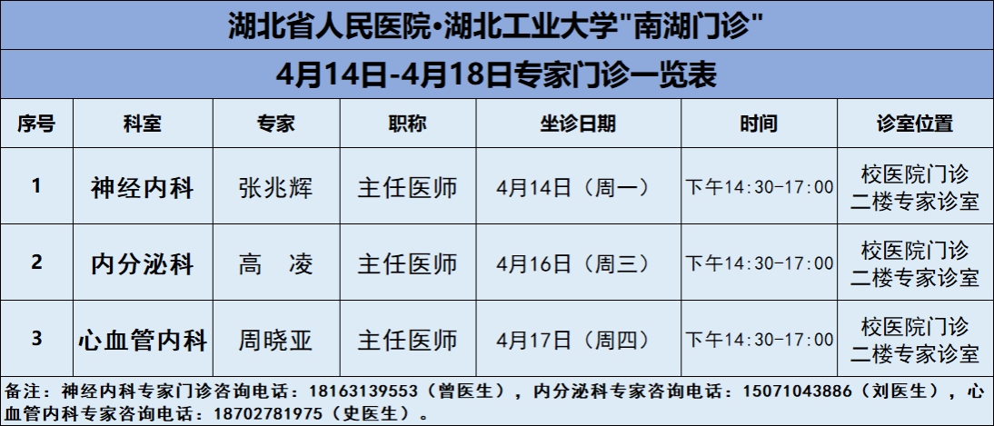 4月14日-4月18日,欧洲冠军联赛_2024年欧洲杯投注-【官网直营】医院将邀请湖北省人民医院知名专家——神经内科张兆辉主任、内分泌科高凌主任、心血管内科周晓亚主任三位专家教授前来校医院坐诊(具体坐诊信息见下),请广大师生、周边居民持续关注南湖门诊专家坐诊信息,如有: