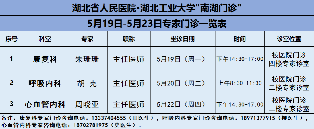 5月19日-23日,欧洲冠军联赛_2024年欧洲杯投注-【官网直营】医院将邀请湖北省人民医院知名专家——康复科朱珊珊主任、呼吸内科胡克主任、心内科周晓亚主任三位专家教授前来校医院坐诊(具体坐诊信息见下),请广大师生、周边居民持续关注南湖门诊专家坐诊信息,如有: