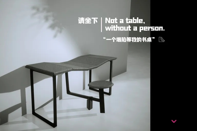 《请坐下 Not a table ,without a person》 作者:鲁子昱 指导老师:彭晓莹 利用桌面与座椅的连接结构去形成相互作用,以使用者坐下的行为来实现桌面的功能,去营造出人与家具的“共生”关系。