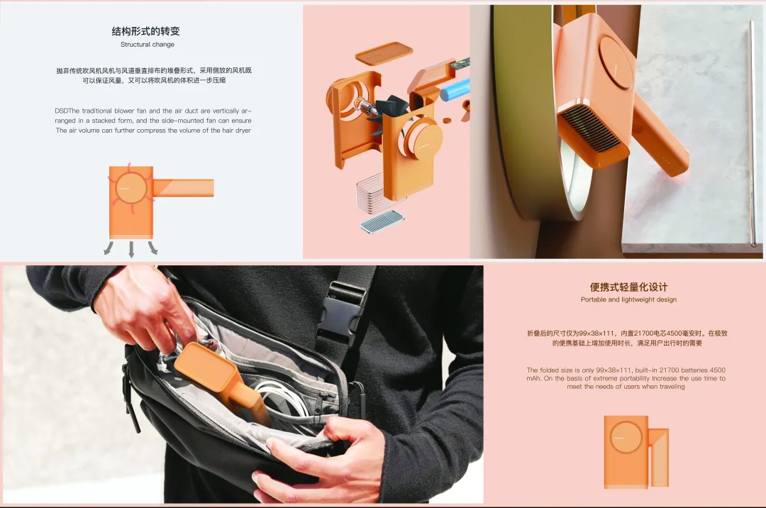 《多功能吹风机设计》 作者:彭琪升 指导老师:李翠玉 可持续设计中模块化的设计理念,将吹风和烘干功能相结合,提高产品的使用率,通过指示灯颜色变化来提示用户产品使用的状态。